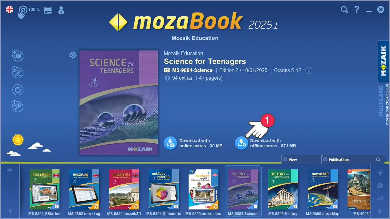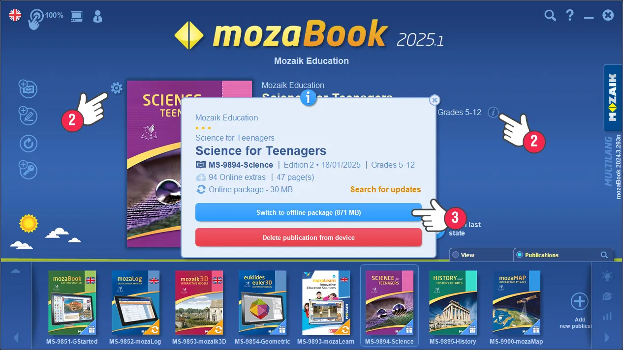 mozaBook- книгите могат да бъдат ползвани онлайн и офлайн (1). Офлайн версията винаги изисква повече свободен обем в твърдия диск, но след свалянето книгите могат да се отварят и без активна интернет връзка и да се ползва интерактивното съдържание (3D сцени, видео, упражнения).