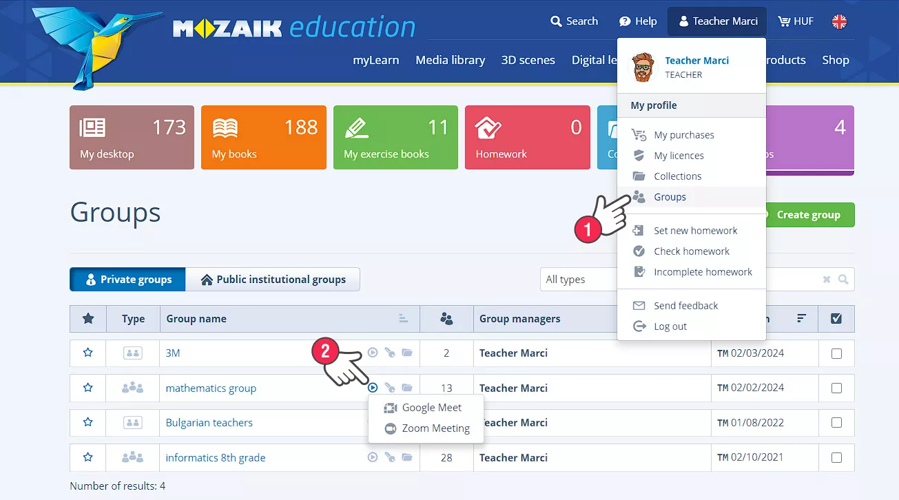 За да започне видеоконференцията, натиснете бутона групи (1), кликнете върху съответната група върху бутона видеоконференция (2), и изберете платформата (Google Meet, Zoom), с която желаете да започнете работа!