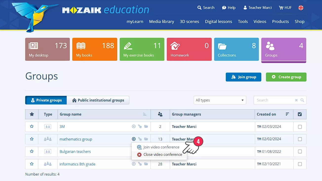 Потребителите с учителски профил могат да създават групи. Те могат да започнат видеоконференция с участието на членовете на групата.
