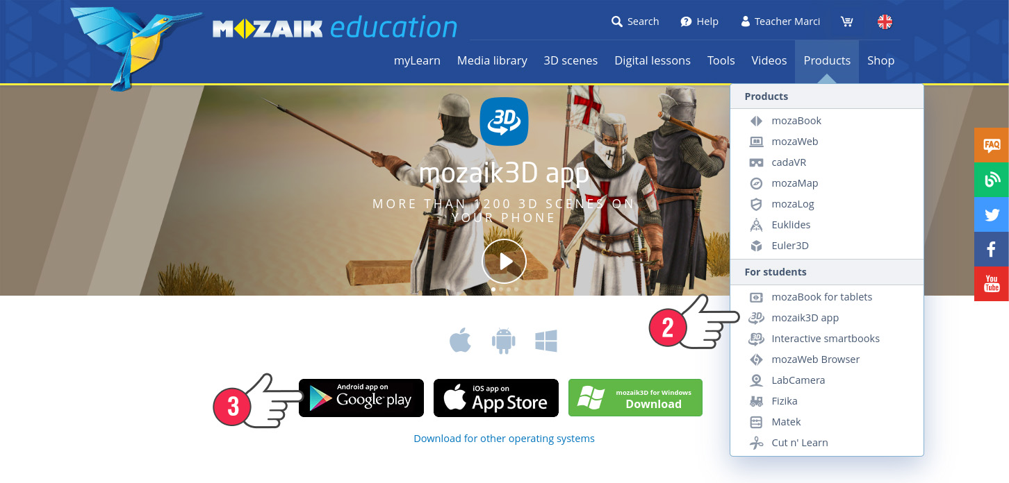 Приложението mozaik3D ще намерите и в менюто Продукти. Пуснете инсталирането оттук, ако изберете бутона Google play (3).
