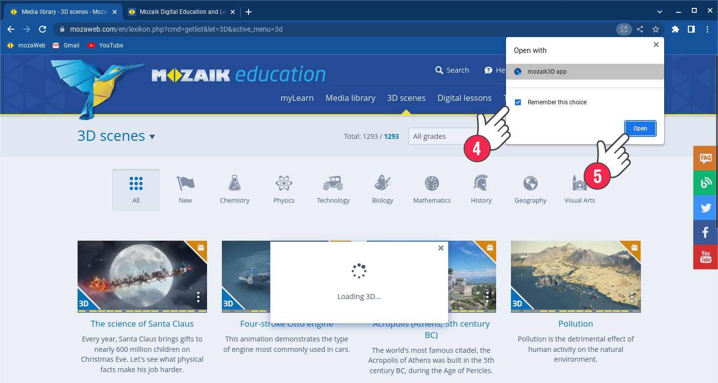 След като инсталирате успешно приложението mozaik3D, кликнете върху една 3D-сцена. В съобщението, което се появява в браузъра отбележете квадратчето (4) и кликнете върху бутона Отваряне (5). Следващия път 3D-сцената ще се отвори след първото кликване