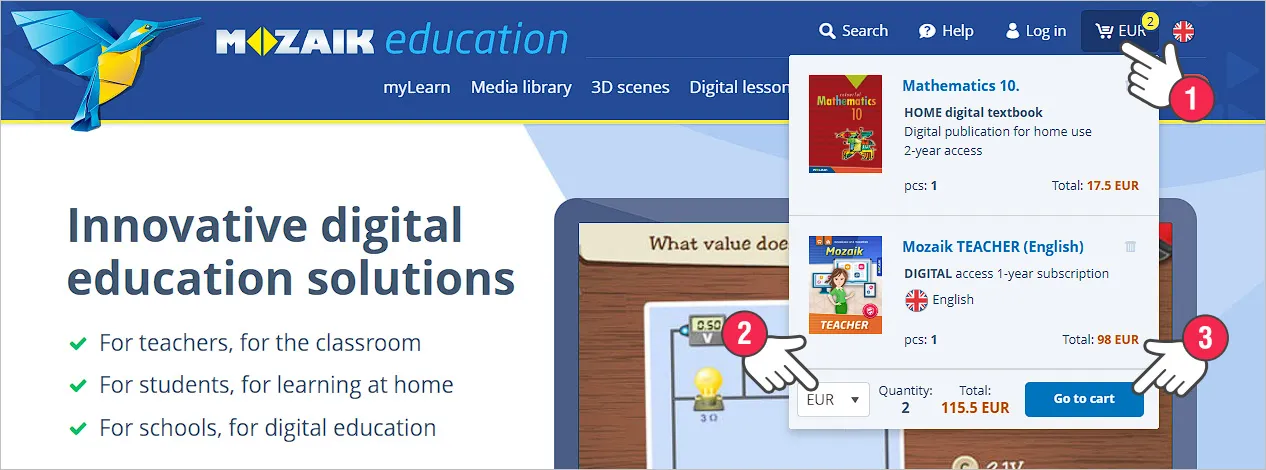 If all the products that you want to buy are in your cart, click on the Cart icon (1) on the page header. If you have not done it yet, choose the currency (2) in the drop-down menu – the invoice will be issued in the chosen currency –, then click on the Go to cart button (3).