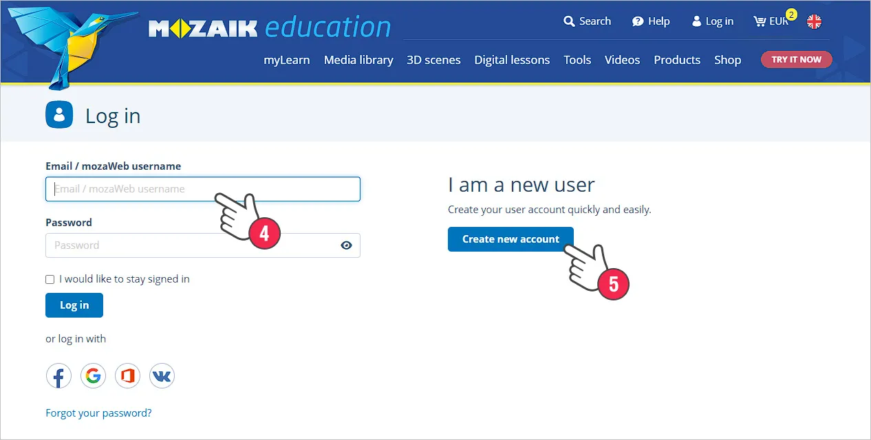 Check the products added to your cart. If everything is correct, click on Proceed to order confirmation. If you have not logged in previously, you will be taken to the login page. Log into mozaWeb (4), or choose 'Create a new account' if you are not yet registered (5).