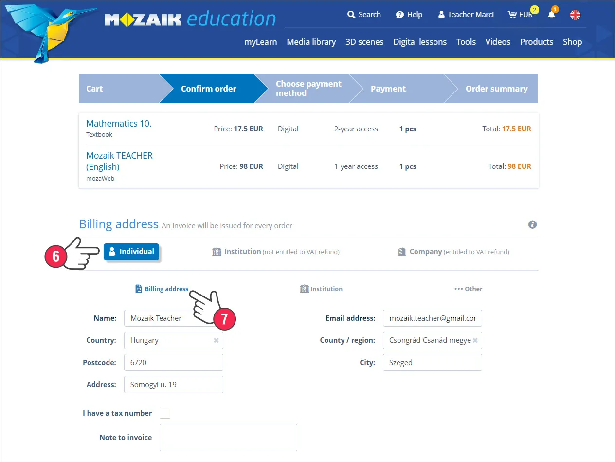 On the Order confirmation page – if you have not entered this information previously – in the Billing information section type in your billing information and your Billing address (7) as well.