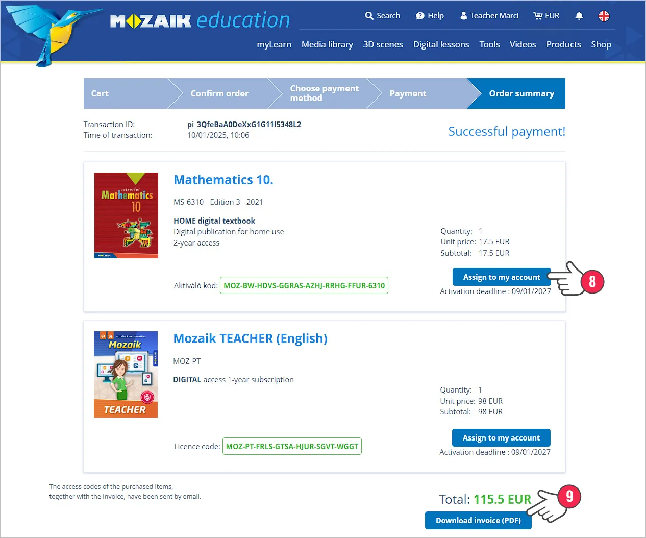 If your payment was successful, you will be redirected to the Order summary page, where you can view the products you purchased and the activation codes or licence codes of the products highlighted in green. Here, you can also activate your digital publications or your Mozaik Student / Teacher subscription, assigning them to your account (8). You will also find the invoice for your purchase here (9).