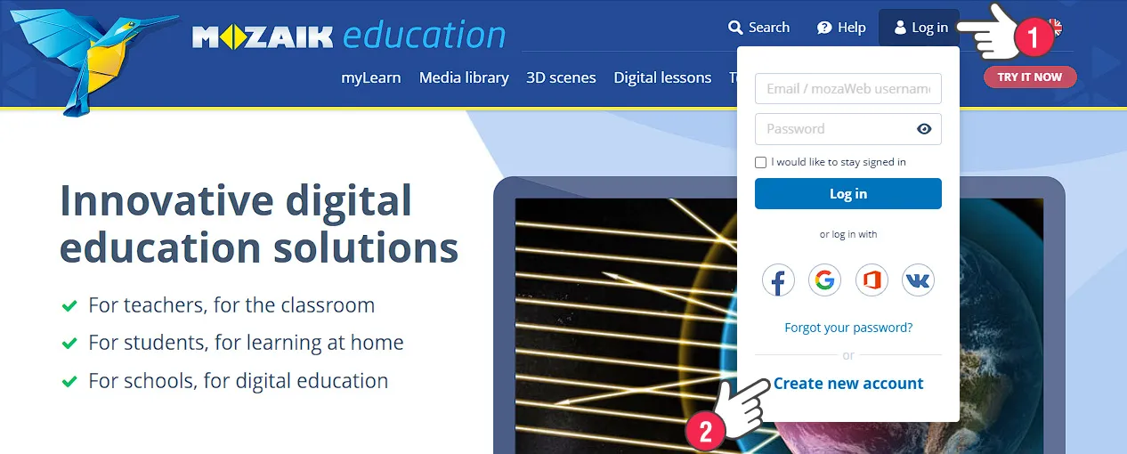 Отворете в заглавието на страницата Влизане panelt (1), и изберете панела Създаване на нов профил (2)!