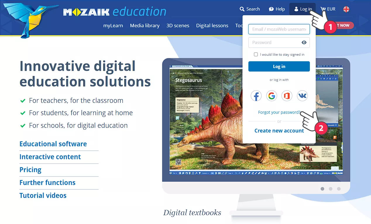 При забравяне на паролата, имате възможност да създадете нова парола. Отворете панела (1) за влизане в страничната лента на страницата и изберете "забравена парола" (2) :