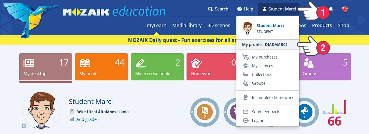 При влизане в mozaWeb, кликнете върху nevedre (1) и изберете от падащото меню изберете Моят профил (2):