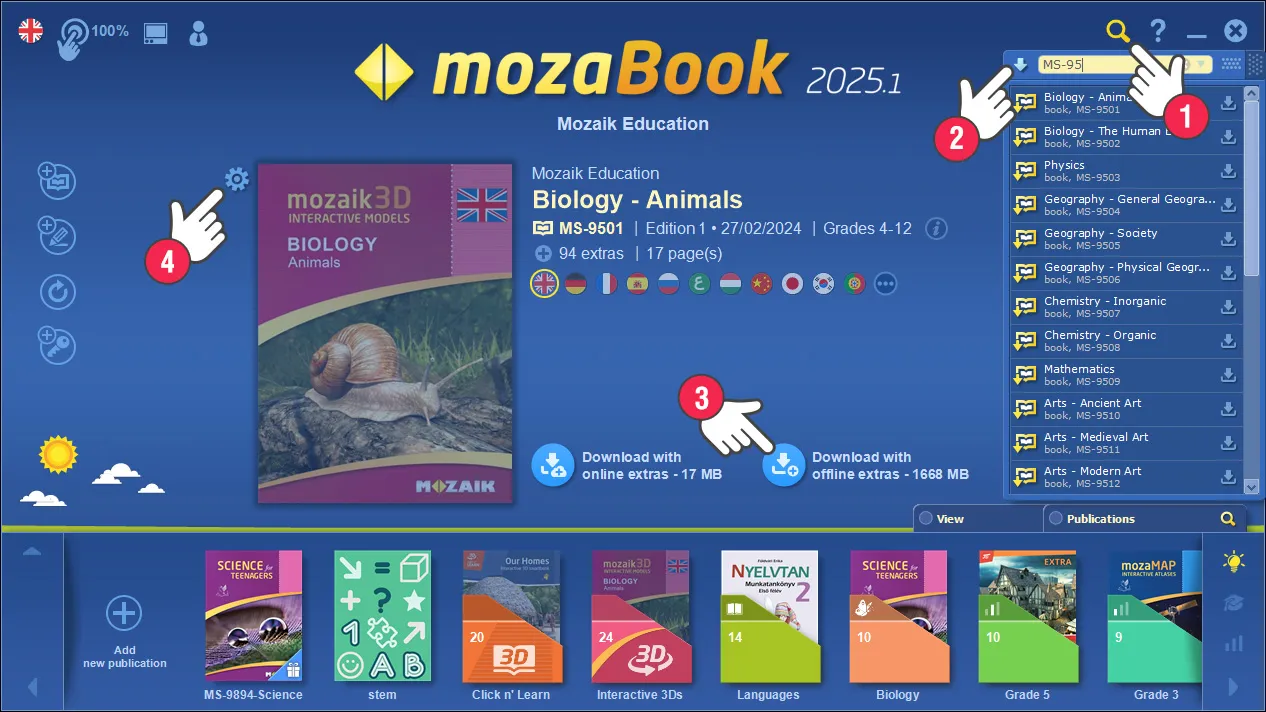 На първата страница на mozaBook, в горния десен ъгъл на екрана кликнете на иконката лупа (1), и впишете в полето за търсене следното: "MS-95". Кликнете на стрелката (2), за да се появят резултатите от търсенето на долния ред, оттам можете да изберете и изтеглите книгите, свързани със съответния учебен материал (напр. физика, биология и т.н.), offline версия (3).