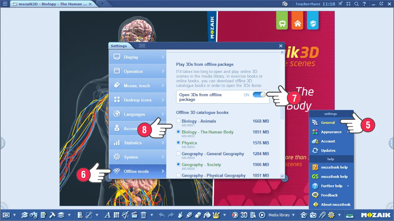 Отворете едно издание, след това кликнете в менюто Настройки => Общи (5) и в отворения прозорец изберете режим офлайн (6). Скролнете надолу пускане на 3D ресурси в офлайн пакет и включете бутона (7). Тук ще видите офлайн версиите на кои книги са изтеглени на компютъра ви. При нужда можете да ги отбележите и тук (8), ако искате да изтеглите нови или да изтриете някои, за да освободите място.