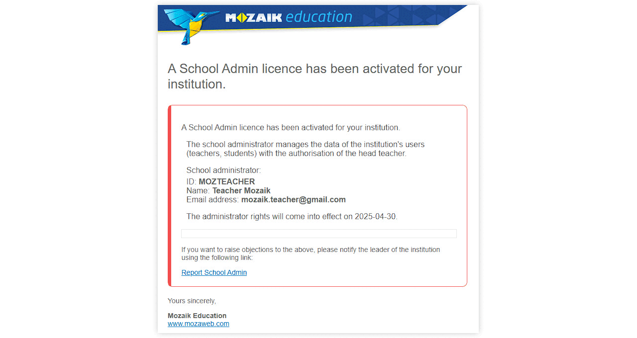 По съображения за сигурност при активирането на закупения лиценз School Admin всички училищни потребители (учители, ученици) получават съобщение на регистрирания си имейл адрес, в който се уведомяват, че активиращият ще притежава права на School Admin за управление на техните данни. В съобщението се съобщава и името на активиращия, mozaWeb идентификацията му регистрирания му имейл адрес..