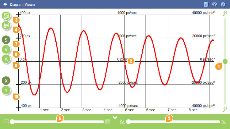 Object characteristics (displacement s(t), velocity v(t)) will be displayed in the diagram panel. |