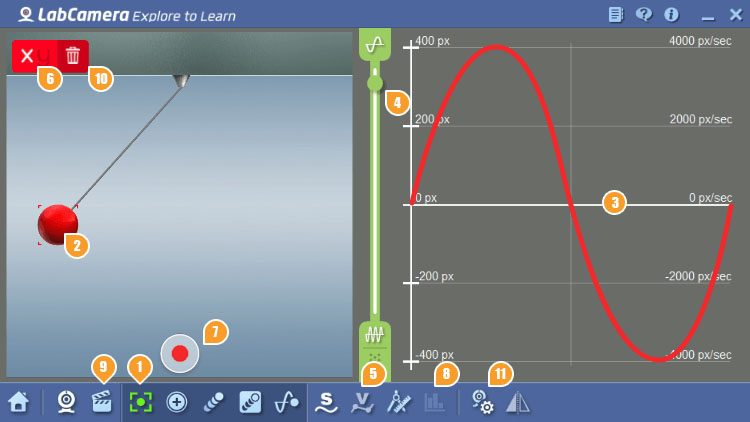 The Kinematics function allows tracking of the horizontal and vertical movement characteristics (displacement, velocity, and acceleration) of one or more objects in real time. The software is capable to capture a maximum of 3 selected objects at the same time, allowing complex kinematic experiments.