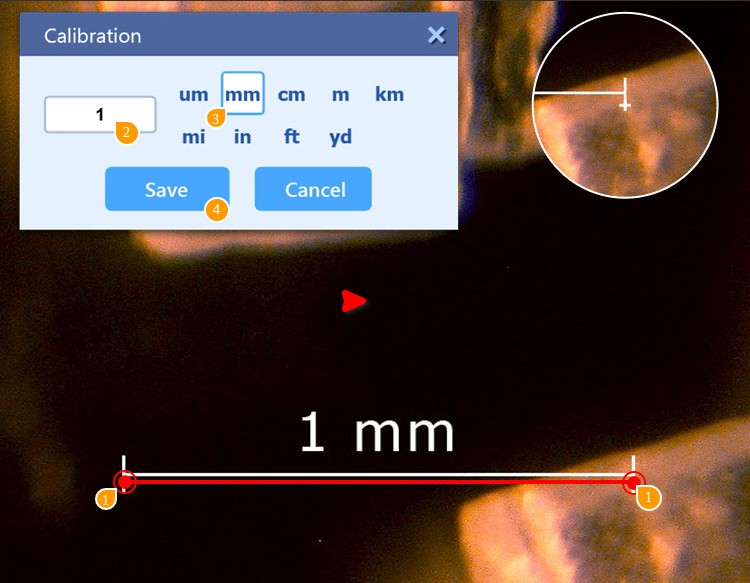 Calibration lets you measure objects in your camera view. If you know one dimension of the examined object, you can use it as a reference to calibrate. In order to calibrate your camera view, place an object of known size (eg. mechanical pencil refill lead) in front of the camera in the same plane where your target object is located and tap the calibration button. You can also use our printable scale sheets available at http://labcamera.com/resources/Sizing_template_metric.pdf