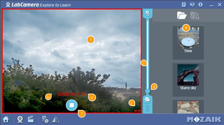 The Time Lapse function helps you observe and better understand the slow processes in nature, such as the formation and migration of clouds, ice melting, the growth of plants, etc. The software makes still shots in configurable intervals and stitches these images into a coherent stream of video.